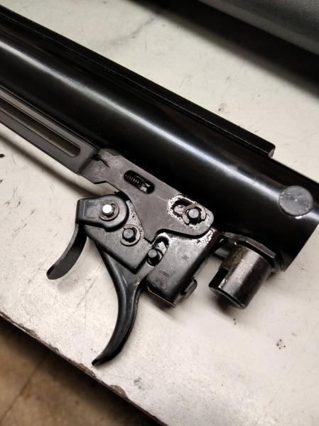 En la 2ª foto se aprecia el muelle que hay encima del tornillo que debería regular el recorrido de los tiempos pero no hace nada, se trata de quitar la grupilla del pasador que hace de eje del gatillo, no hace falta sacar el pasador del todo, si quieres y colocar otro muelle casero mas blando. Respecto al tornillo que creo que es de metrica 2,5 es buscar uno un pelin mas largo para que realmente actue, si se coloca uno demasiado largo puede ocurrir lo que expliqué en el mensaje anterior, no pasa nada si no se aprieta demasiado pero si te pasas de profundidad puedes tener algún problema.