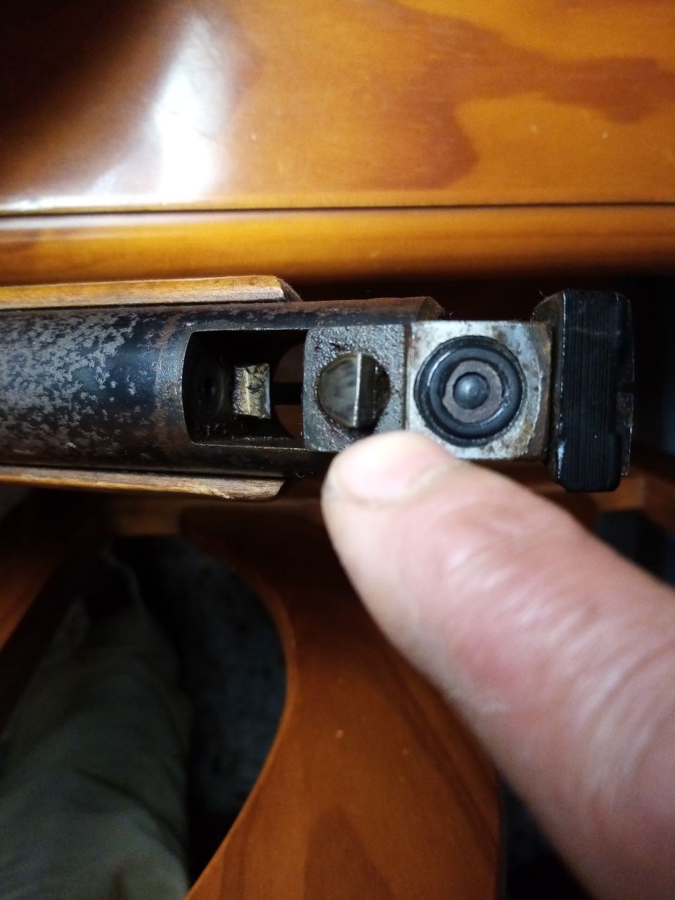 Me dice que piensa que le falta una pieza, la carabina cierra y dispara, pero él cree que le falta una pieza justo debajo de donde se mete em balin, una pieza que cuando se cierra el cañón encaja con otra que está en el otro lado y asegura que el cañón no se vuelva a abrir.