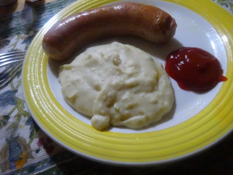 Salchicha Berliner Knacker con puré de patata y ketchup atabascado.