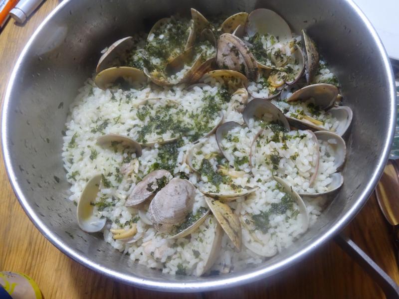 Hoy almejas de la ría del Asón con arroz de Calasparra que están terminando de hacerse, las fotos luego.