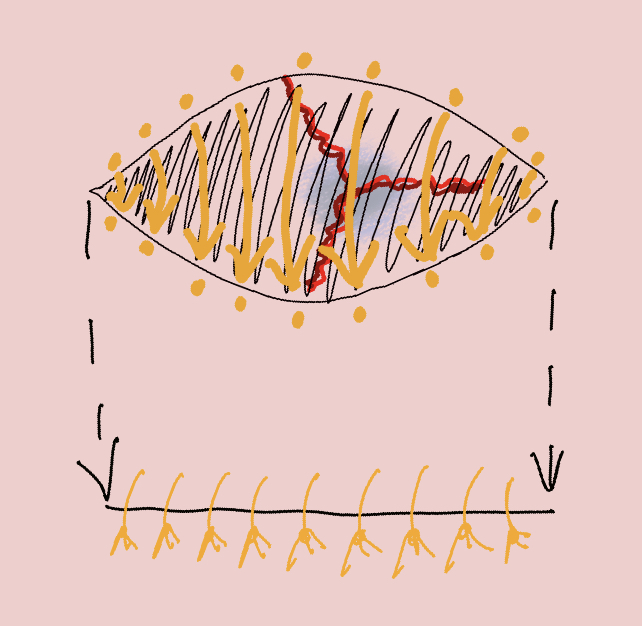 Cómo funciona esto: dos de los tres bordes se aproximan (se juntan) suturando de la manera habitual, pero utilizando una puntada especial con cordón. Eso deja el tercer borde abierto al igual que lo estaría un drenaje quirúrgico en otro caso. Luego, los dos bordes suturados se curan, permitiendo que el tercer borde sea un drenaje. Luego se cura de abajo hacia arriba de una manera llamada curación por TERCERA INTENCIÓN .