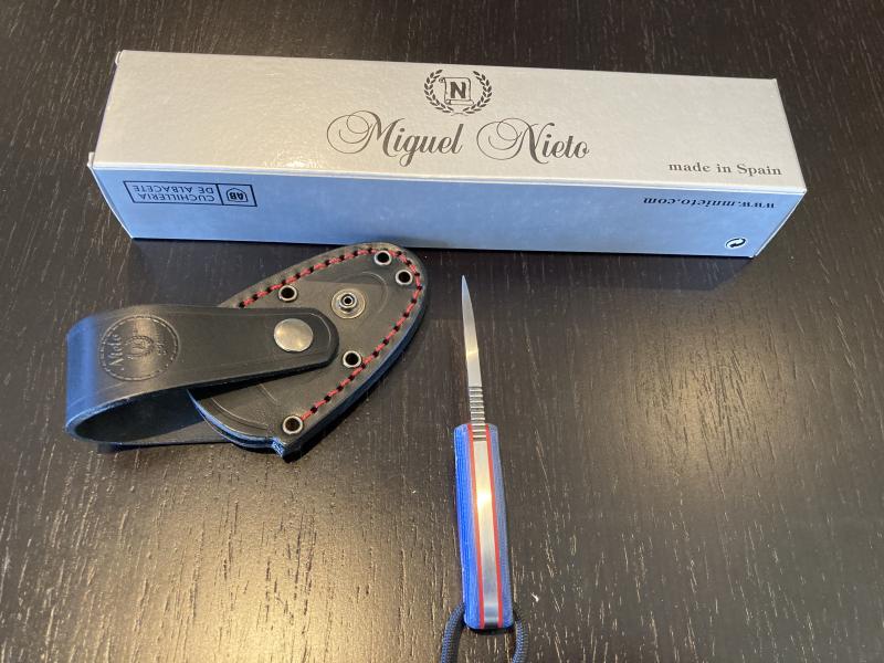 2. Nieto Chaman Micra, acero Böhler y micarta bluejean (azul). Funda de cuero negra.....45€