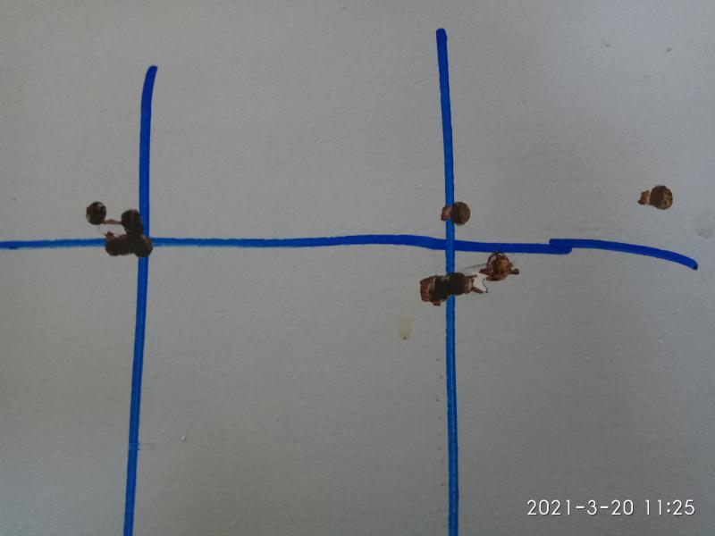 Hola, la distancia mínima al ojo tiene que ser de unos 25 centímetros y como no encontraba nada al final seguí el consejo de non fuyades y me he puesto a repararla. El problema era que los tornillos que sujetan la torreta estaban pasados de rosca, una vez extraídos y sustituidos el resultado es el siguiente. A diez metros, apoyo delantero y perdigones solognac pointu. Un saludo.