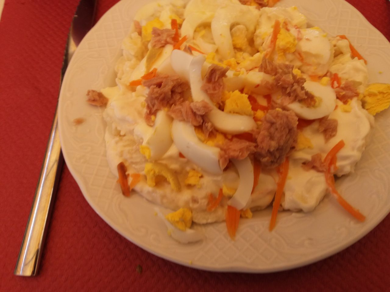 Un platito de ensaladilla rusa muy casera, y mi Sargenta una ensalada de queso de cabra y nueces, tomate, etc.