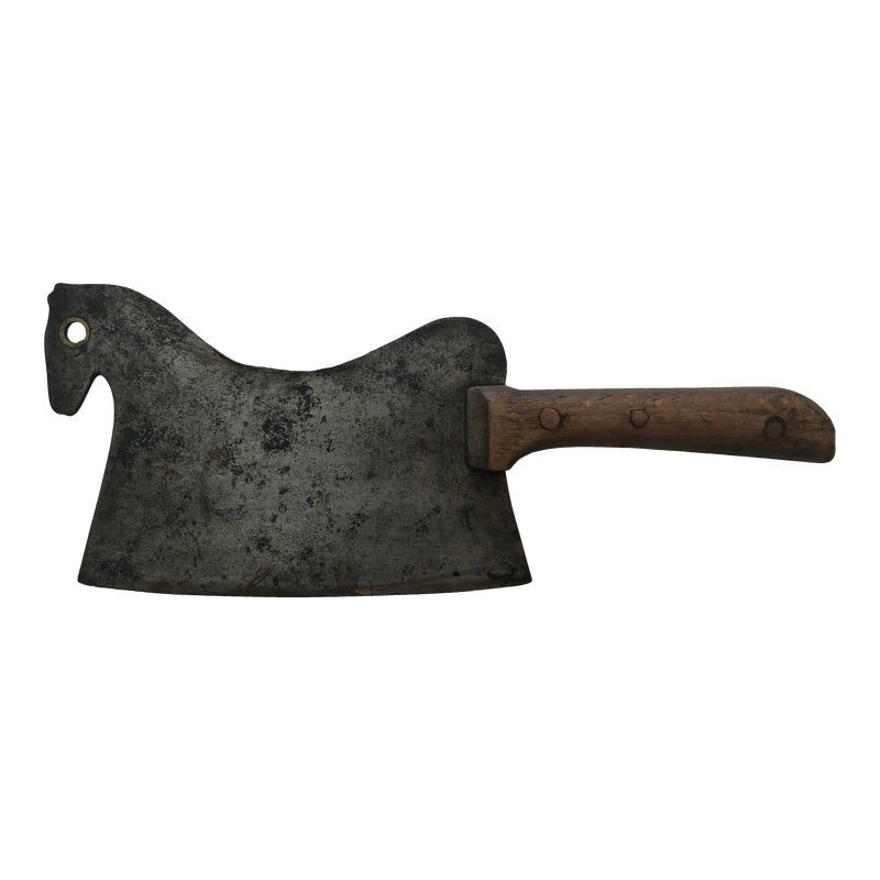 Francamente.... tiene una pinta de ser una pieza de los 60 o 70 en acero al carbono con mal cuidado. el ojo del caballo se usa para colgarlo y posiblemente es el hacha de carnicero de una carniceria de carne de caballlo que en esos años aun se estilaba.