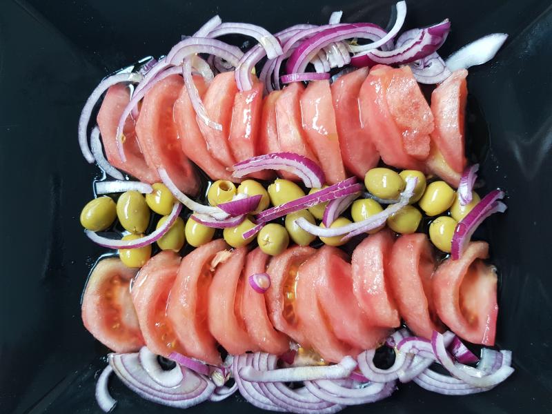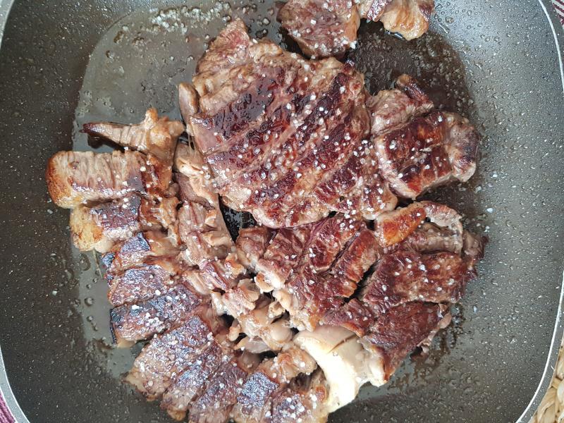 Hoy chuleton de vacuno para piedra, pero lo he hecho en sartén. y ensalada de tomate sin piel con aceitunas y cebolla, aceite de oliva y vinagre Jerez