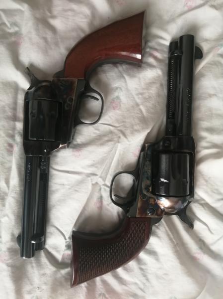 Tengo un revolver Uberti Peacemaker Evil Roy del 45 Long Colt cañon 4 3/4 y otro Uberti Peacemaker del calibre. 22 de mismo cañón amparadas en Libro de coleccionista. Nunca he usado el de. 45. y el otro apenas tiene pocos disparos. Los cambiaria por un [b]STAR B, STAR BM, COLT 1911 o ASTRA 600.