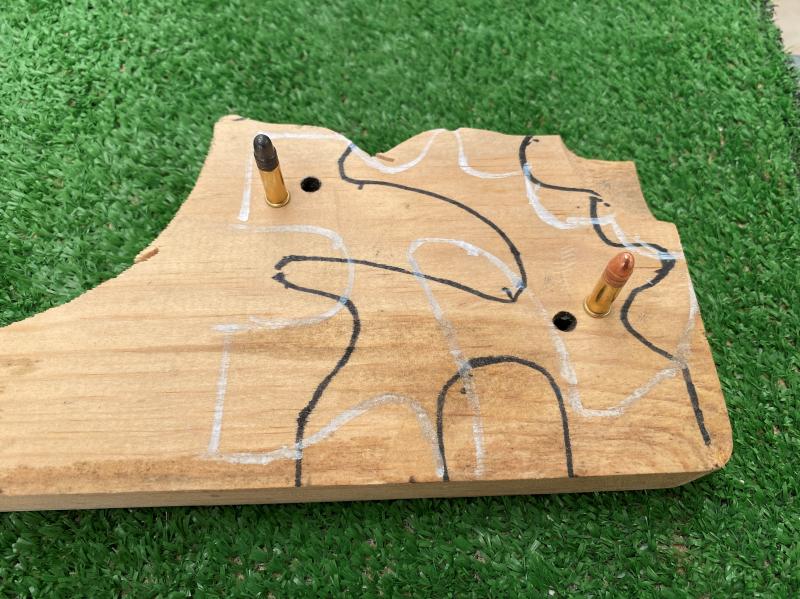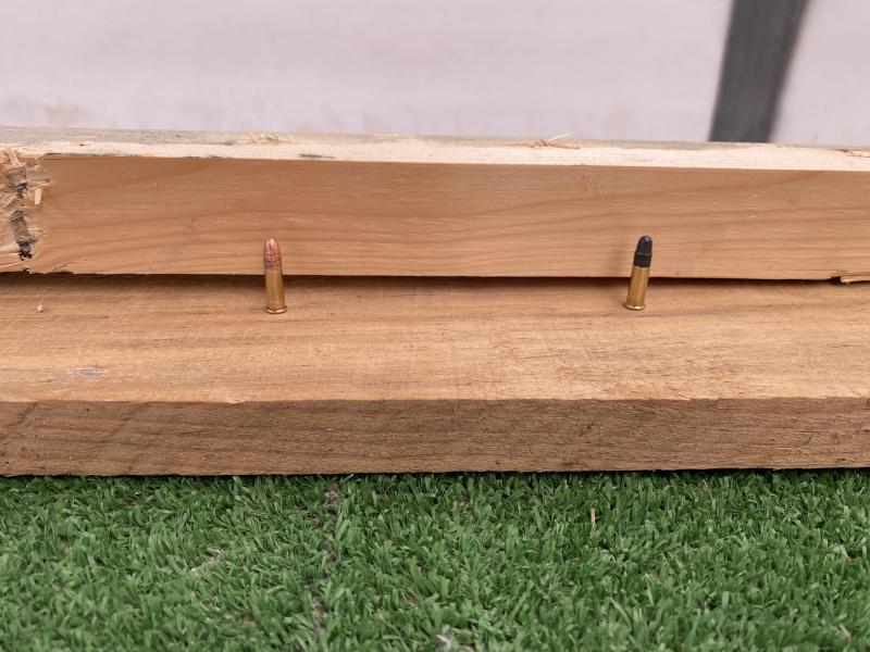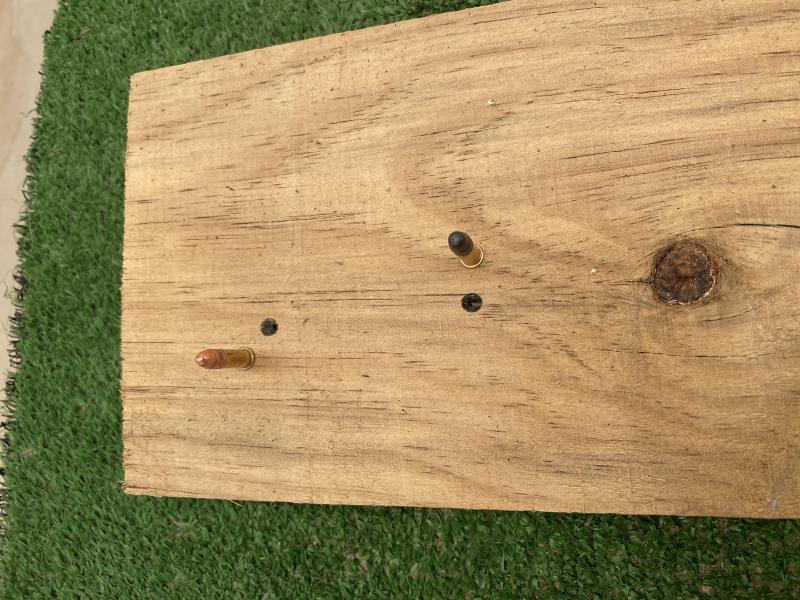 El boquete de salida tampoco es fiable, pues es madera, no carne, lo cual significa que en madera, por su densidad, ambas pueden comportarse igual, pero no en tejido, carne o hueso, no, o quizás si, pero puede una pivotar, fragmentar o atravesar y la otra no tanto, en tejido,músculo, grasa y hueso.