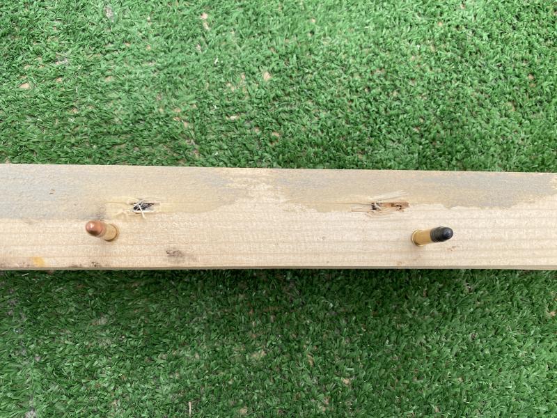 El boquete de salida tampoco es fiable, pues es madera, no carne, lo cual significa que en madera, por su densidad, ambas pueden comportarse igual, pero en tejido, carne o hueso, no, o quizás si, pero puede una pivotar, fragmentar o atravesar y la otra no tanto, en tejido,músculo, grasa y hueso.