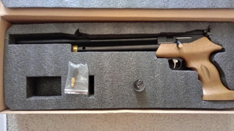 Pistola PCP con cacha de madera. Puede usarse con cargador o como pistola monotiro. Hasta 14 julios de potencia con más de 30 disparos por deposito. Gatillo ajustable, cerrojo lateral y alza y mira incluidas.
