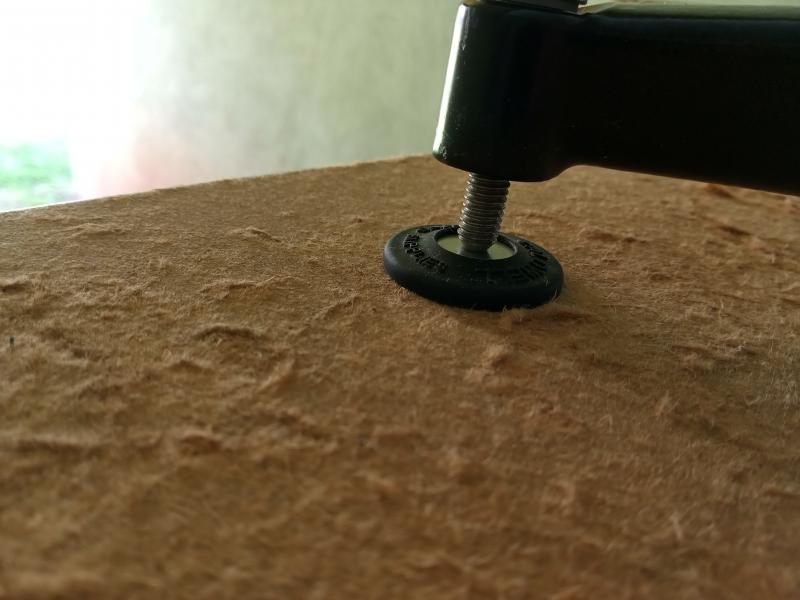 Las mesas de Bench-Rest no son todas iguales aunque lo parezcan. Esta mañana iba a tirar a 50 m con la carabina de Open, he montado los trastos en una donde nunca me pongo y enseguida me han dado ganas de comprobar si el tablero estaba horizontal. Estaba tan inclinada que he tenido que sacar el tornillo de la pata izquierda y meter el de la derecha todo lo que se ve en las fotos. Entonces el arma no estaba canteada.