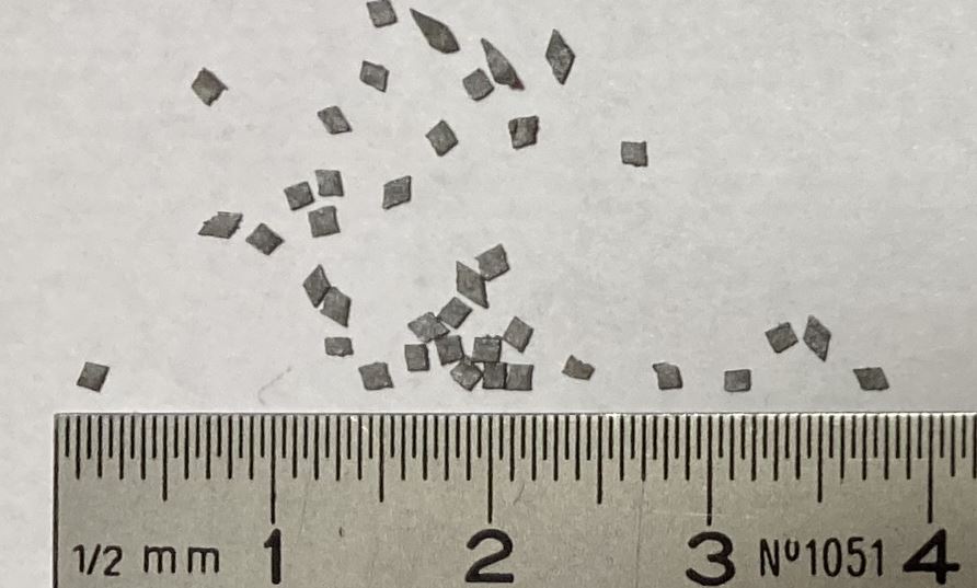 Es romboidal de 1 mm de lado, 1,5 de punta a punta.