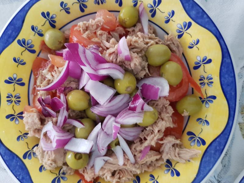 Ensalada tomate atún y aceitunas, aliniado con aceite de oliva y vinagre Jerez.