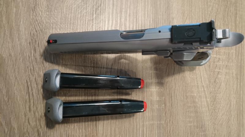 Se vende con dos cargadores, muelles de recuperación de repuesto, muelle y biela de repuesto para modificar la presión del gatillo y maletín de transporte.