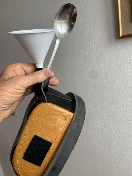 También se venden unos embudos con tubo largo, de modo que no sólo es más cómodo y evita que se salga sino que también se dirige el chorro al fondo y al rincón que uno quiere. Lamento no poner foto, ya que tuve uno y se lo presté a algún buen amigo que no me lo devolvió y ahora no recuerdo quién era.