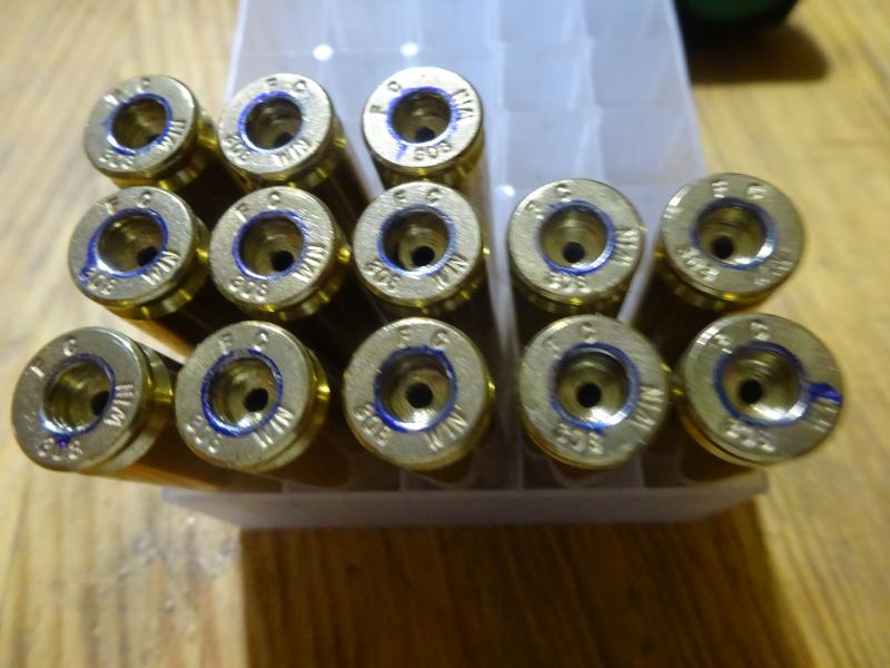Como quedan una docena del fraile de vainas FC del .308W despues de recalibrado integral y limpieza del alojamiento del pistón con el util de RCBS que existe al efecto.