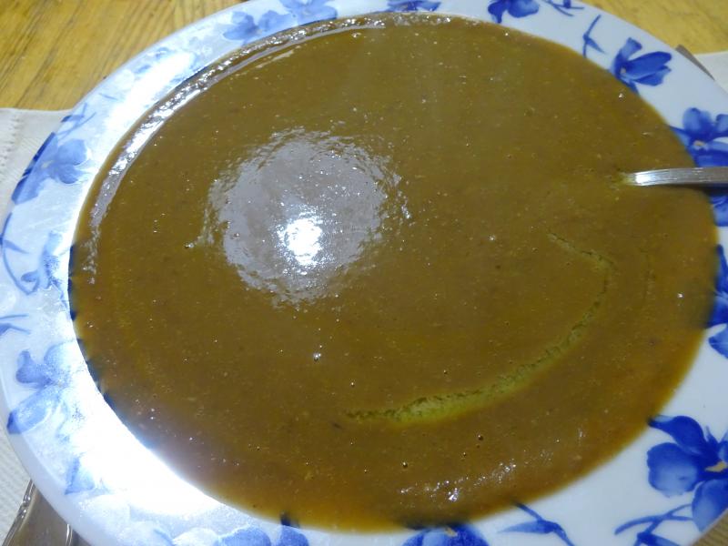 Más puré de lentejas con reflejo de la luz de la mesa de la cocina como principio y de 2º lomo de bacalao a la romana con pimientos riojanos, rico rico.