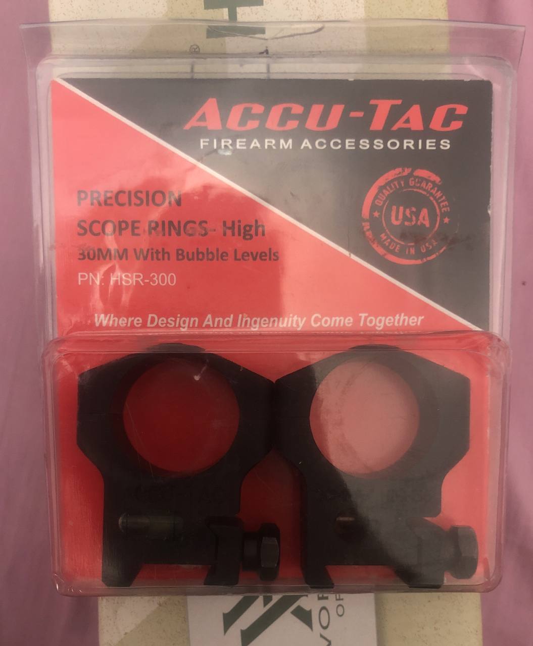 Las anillas son las Accu-Tac HSR 300 (Altas) para visores de 30mm. Están como nuevas aunque una de las anillas tiene un minúsculo arañazo. Ambas anillas incluyen nivel burbuja para evitar el canteo del rifle.