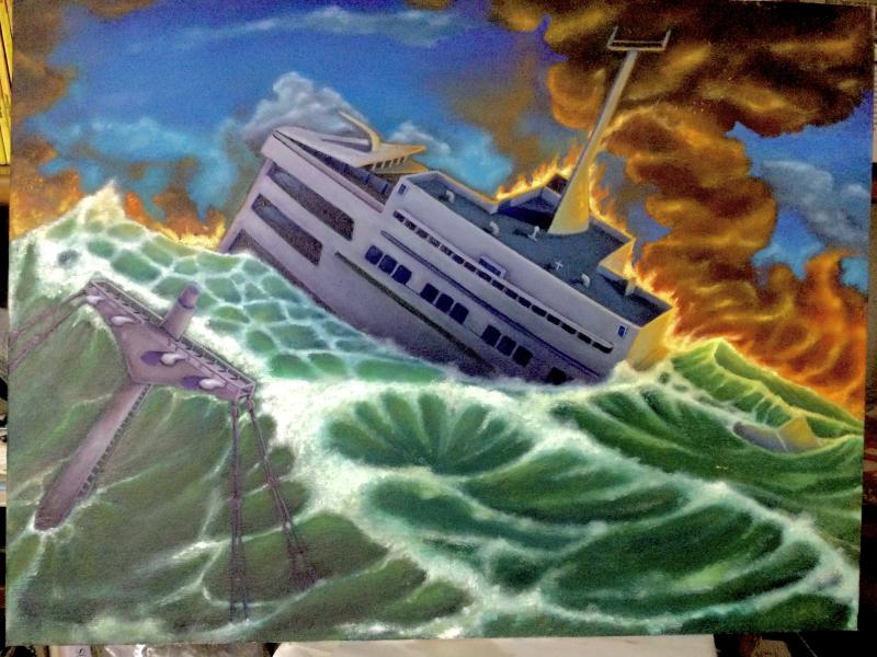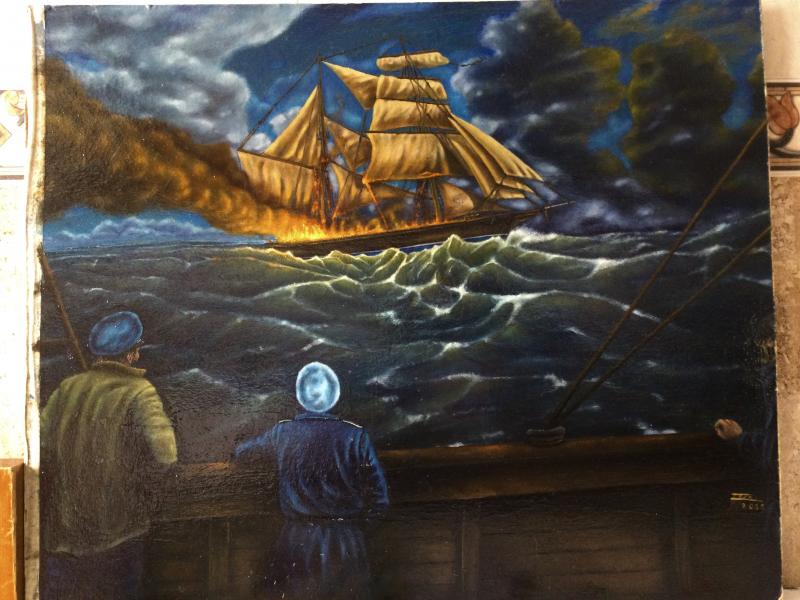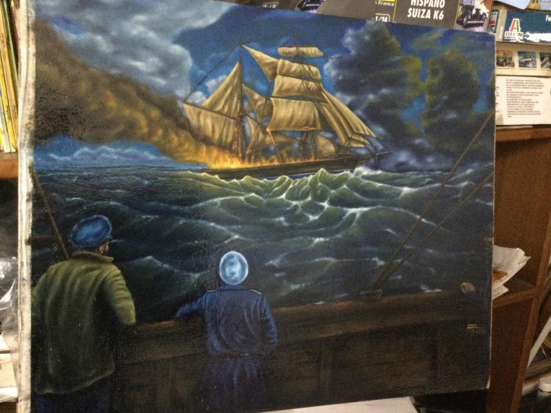 Mis cuadros no siempre gustan y tienen fallos y logros tecnicos al mismo tiempo, pero no aburren.( Sefundo cuadro la parte inferior izquierda esta sin contraste porque el foco de luz ladeado ha quemado foto por ese lado). Cuadro sin terminar, faltan detalles en mar, barco y humareda).