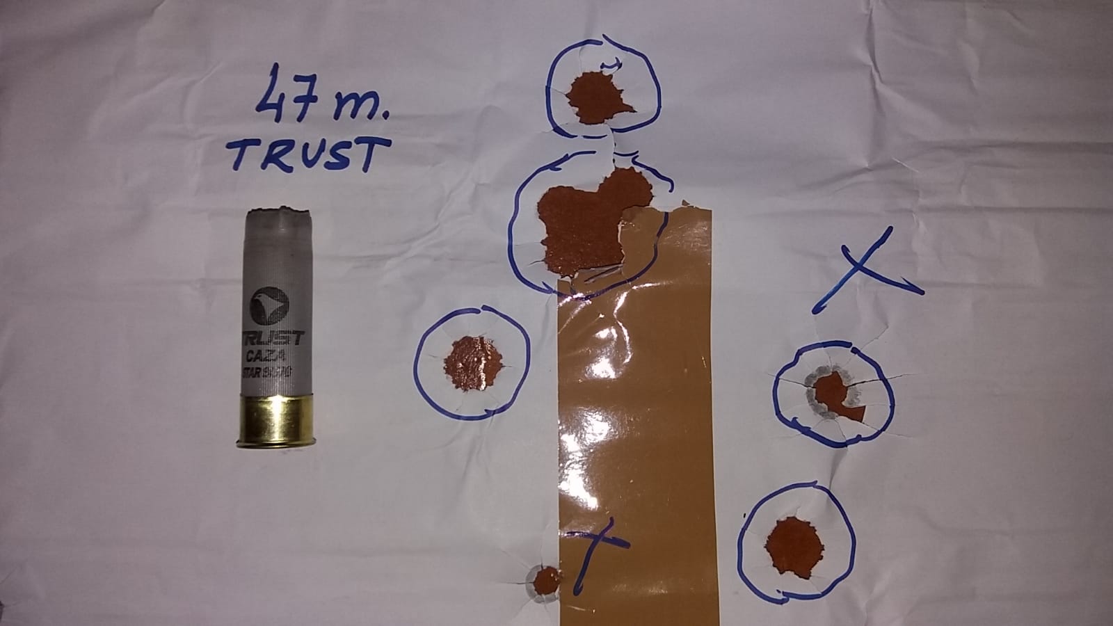 En el video se ve perfectamente la pruebas que hace, a 91metros primero tira con cartucho de perdigones, postas, cartuchos de perdigones cortados (para que actuen como una bala) y luego cartuchos de bala. Luego repite a 183 metros y a partir de los 275 metros ya solo tira balas de 28 gramos. Esta claro que a 91metros y a 183 metros los mete en la tabla sin problema, ya a 275 metros mete solo dos, pero llegan con fuerza y a 365 metros la bala sigue llegando con fuerza pero no llega a darle a la tabla por muy poco, hay que tener en cuenta que tira con miras abiertas y que la correccion en altura ya es exagerada como para poder ser util.