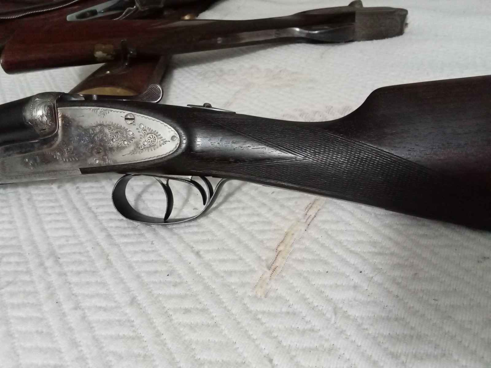 Notese en esta escopeta como la parte que ha retenido barniz orginal, mantiene su tono nogal, mientras que la parte que lo ha perdido, el barniz, a la cual aplicaron generoso aceite de linaza, esta practicamente negra, y es irrecuperable, pues le han dado tantas manos, que no recupera color lijando.
