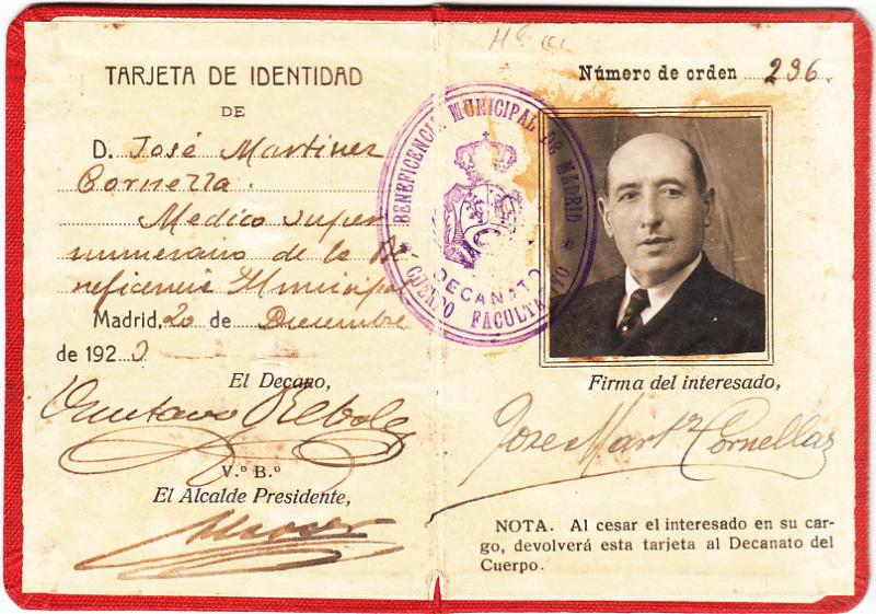 DOCUMENTO :Tarjeta de Medico de la Beneficencia Municipal de Madrid de 1920