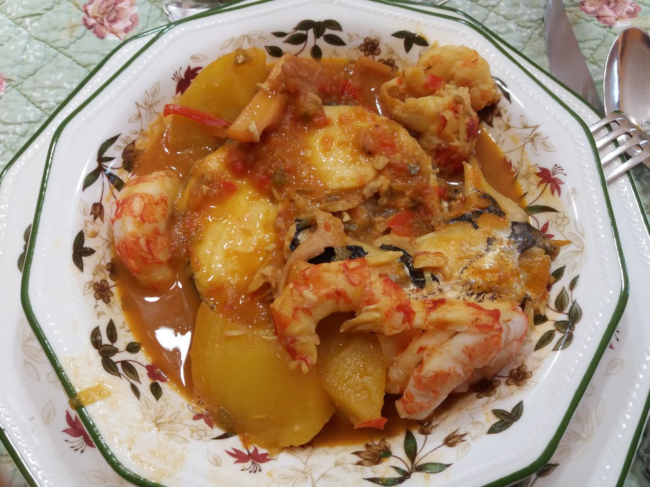 Merluza fresca con gambones, patatas y caldo del fumé de los mariscos.