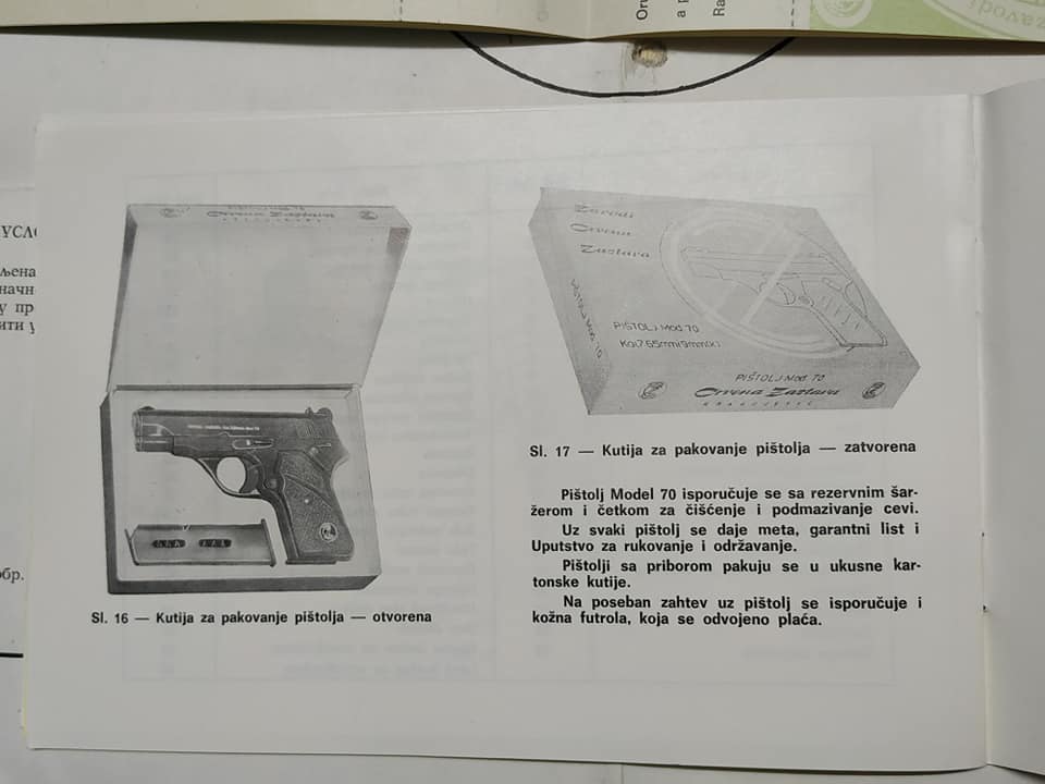 Escasísima (al menos en España) caja original de la pistola yugoslava Zastava Mod 70 de calibre 7,65 o 9mm corto producida en la localidad serbia de Kragujevac, la caja está en buen estado y le acompaña el manual de instrucciones, la garantía del arma y un blanco del banco de pruebas de la fábrica fechado en diciembre de 1974.