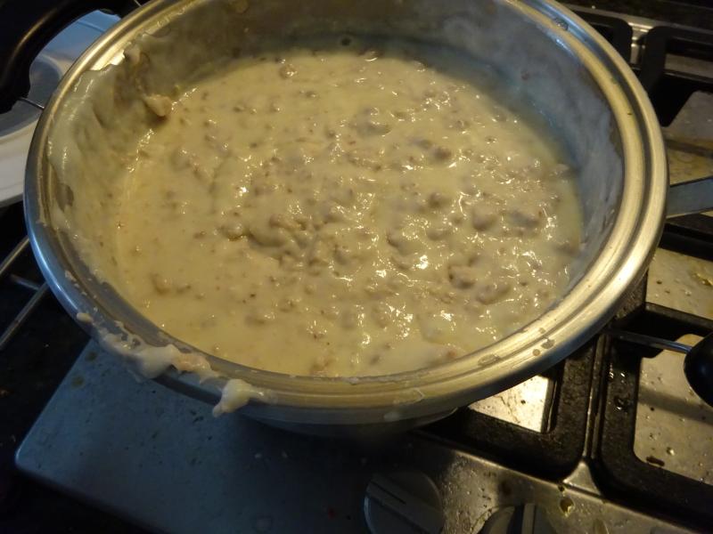 Masa para croquetas con la gallina del caldo, paletilla iberica muy finamente picada y huevo duro, se pone todo en la Termomix y sale la farsa lista para emulsionarla con la bechamel, luego se pone en una fuente para que repose y mañama haremos las formas de las croquetas.