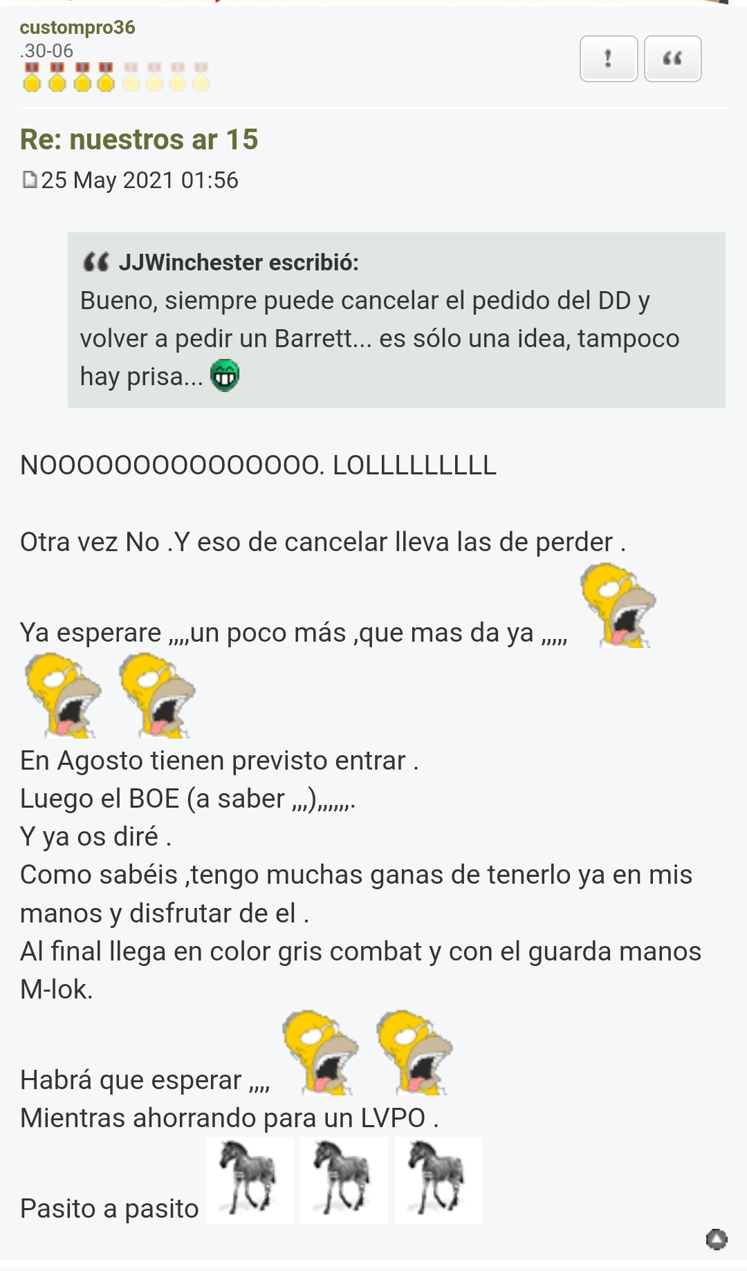 echaba para atrás mientras llegaba el Tikka pérdida esos 150 €. Al final tardo 9 meses, para un rifle que no tiene que pasar ni BOPE ni gaitas............. Ahora a por el gordo, me entero que van a entrar unos Barrett por qué han pillado la importación, es solo cuestión de tiempo la llegada, pues si tiempo ........ 19 meses como es normal con sus entregas de dinero...........cada vez que llamaba una película nueva, incluso al año de estar esperando todo se torció porque Barrett entro en un tema de que no podía vender directamente y hubo que partir de 0........... Paciencia en estos casos lo que queda es paciencia, 19 meses....... eso o pedir la resolución del contrato y ahí es donde entran ya los abogados. :saluting-soldier: