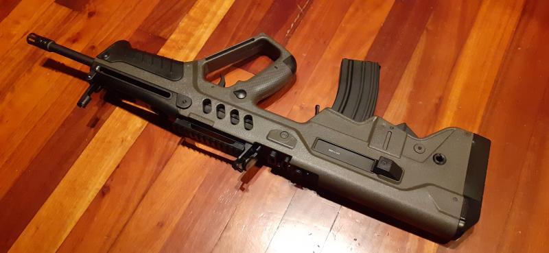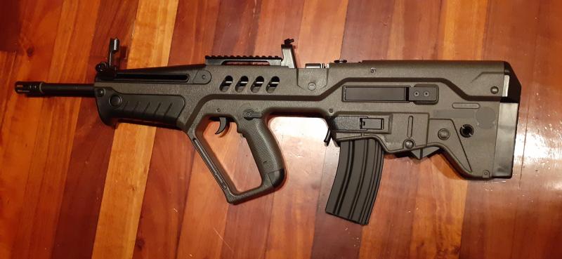 Vendo, S&T - TAVOR 21 Explorer versión OD, réplica airsoft del rifle de asalto israelí, sin estrenar. De configuración bullpup, cuerpo de polímero, cargador de "metal" e intercambiable con otros cargadores del Scar, M4, M16,..... Hop-Up ajustable al igual que el modo de disparo, miras delanteras y traseras abatibles e integradas. Longitud total de la réplica 780mm, del cañón 510mm. Peso 2,5 kg . Bateria 8,4 v (no incluida) tipo mini. Cargador de 300 bbs de 6 mm. Riel picatiny superior para colocación de un visor, mira de punto rojo, etc. Manual de uso y despiece explosivo. Número de serie identificativo para registro y legalización.
