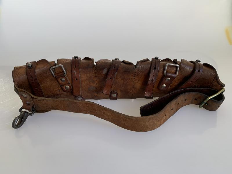 Vendo bandolera 5-bolsillos de cuero para llevar peines de munición del Mauser sueco: M/94, M/96, M/38 y M/41. En buen estado, con una hermosa patina solo posible con el paso de los años. Muy antigua, periodo primera mitad siglo XX. *VENDIDO*