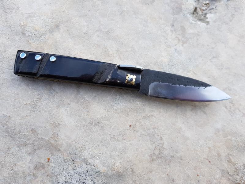 Más bien: o el artesano no ha limpiado la hoja después del temple; o la pletina, de donde por desbaste (y no forja) ha sacado la hoja, venía en color negro.