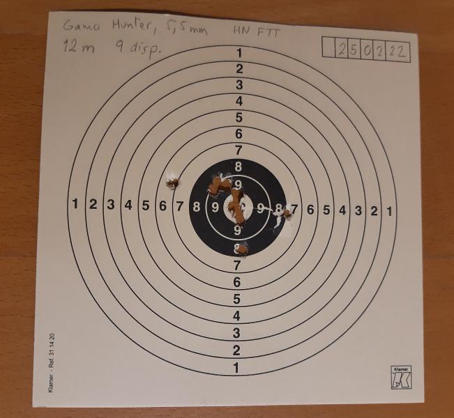 Bueno, poco a poco nos vamos haciendo el uno al otro. Ayer hice esta diana a 12 mts, de pie con sus miras abiertas y usando los H&N FTT. Son 9 disparos sobre una diana Klamer de 14 cm, y quitando el de la izquierda que fue el primero y en frío, los demás razonablemente bien. Parece que la carabina cumple.