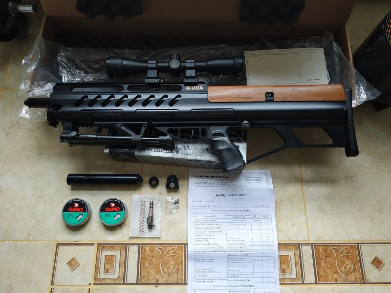 Vendo carabina PCP JKHan Iluda cal.5.5 impecable practicamente nueva con su envase original. La dejo con los siguientes accesorios: Visor Leapers UTG 4x32 mod. Varmint/Predator mas monturas, cubrelentes y caja original, moderador, cubrerosca, Grip frontal, bipode, dos cargadores metalicos, muelle aguja de repuesto, Quick fill de carga con adaptador y el capuchon, juego de juntas, estacion de carga, botella aire scuba 10l y dos cajas de balines. La carabina apenas estrenada, nunca ha salido de casa ni una caja de balines gastada. Precisa y potente, facilmente regulable, es la misma que el modelo Noblesse pero con chasis mas tactico, trae su hoja de control de calidad de fabrica. Autonomia de casi 200 disparos por deposito.