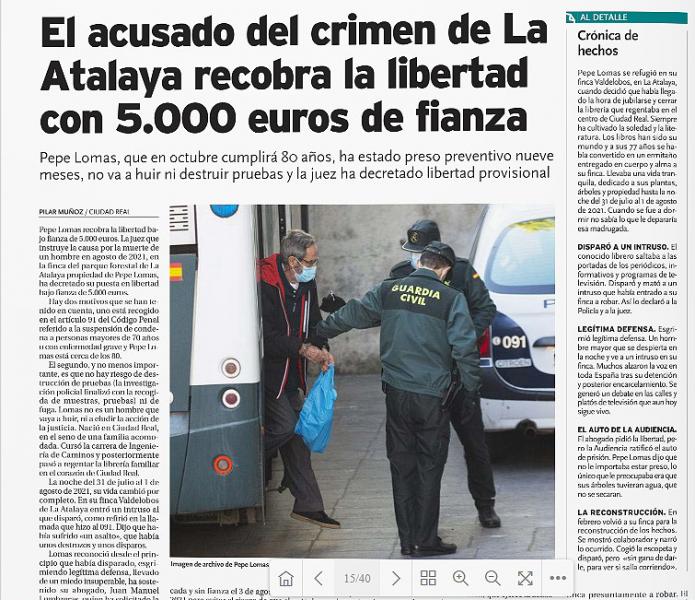 Lomas está acusado de matar a un hombre que entró en su vivienda la madrugada del 1 de agosto de 2021, supuestamente para robar. Los hechos ocurrieron ese día sobre las dos de la madrugada. Según el relato que hizo en su momento el acusado ante la policía y ante el juez, el intruso se coló en el interior de su finca de la Atalaya, situada en Ciudad Real. Él, asegura en su declaración, se despertó porque escuchó ruidos y actuó así como se refleja en la llamada que hizo esa noche a la policía: "Fui a mi dormitorio que es donde tengo una escopeta, que además la tengo siempre cargada y dejé la linterna allí. Sigo el camino de los destrozos y en frente de una cuadra que tengo, veo a una persona un poco agachada y en las manos tenía una motosierra".