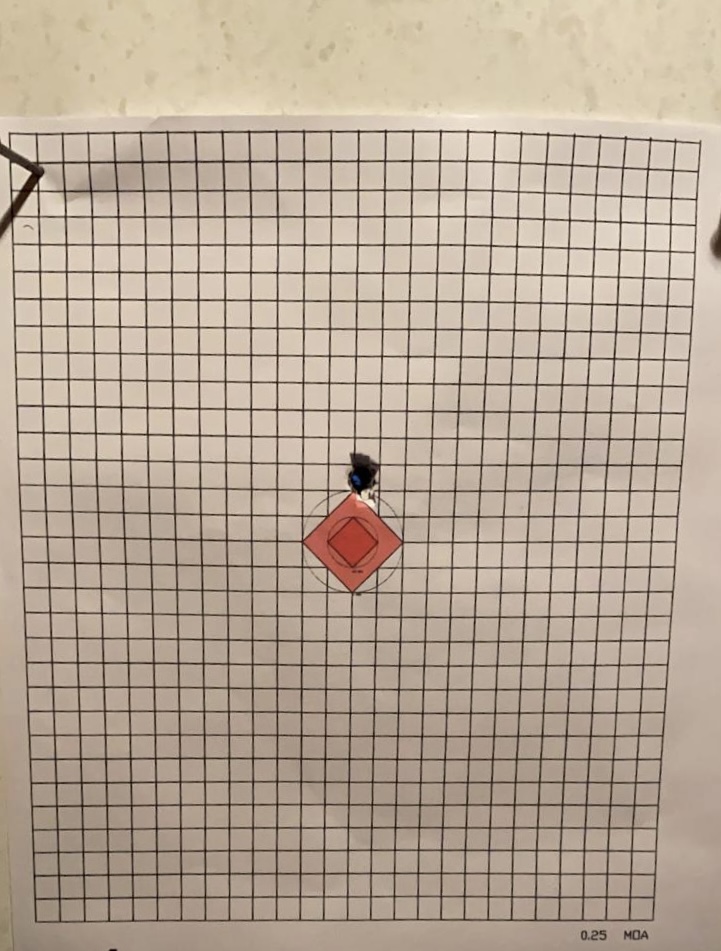 Foto justamente de ayer a mediodía para ver si mantenía el cero desde su puesta en tiro, con 19 disparos encima desde que se limpió el cañón y seguía sin limpiar para la prueba.