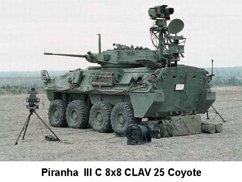 2.- G.D. Piranha III C 8x8 CLAV 25 Coyote con el mismo M242 mas un radar de campo telescópico colocado en el techo del vehículo