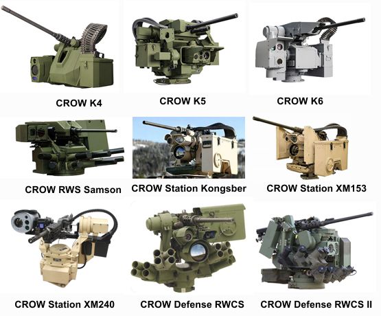 Aquí tenéis un ejemplo de torre CROW de tantas que existen (yo tengo fichadas unas 10 y cada día salen mas), y que básicamente consta de un arma principal normalmente de calibre .50 (12,70x99), 7,62x51 o 40 mm Mk.19, aparte de sistemas ópticos dotados de visón óptica normal de muchos aumentos, infrarroja o térmica, incluso cámaras de video y detectores automáticos de objeticos, y algunas incluso designadores laser.