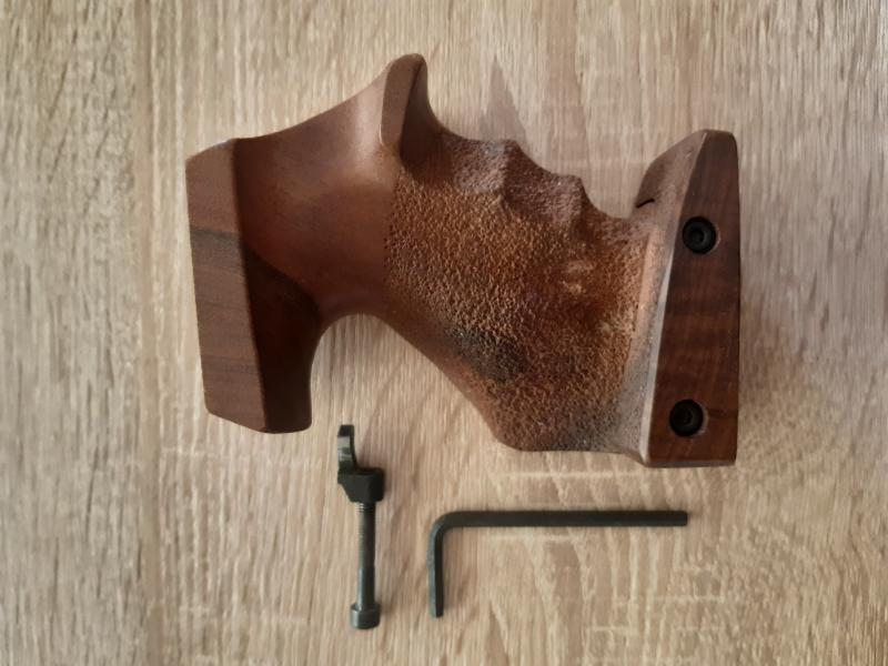Vendo una cacha de Cesareo Morini talla M sin retocar para Walther GSP, y regalo pieza de sujeción al armazón con su llave de allen. Vale para cualquier modelo de GSP incluyendo las que llevan los tornillos por los lados. El agujero que se ve en medio de las letras, es porque tenía puesto un pin de la federación.
