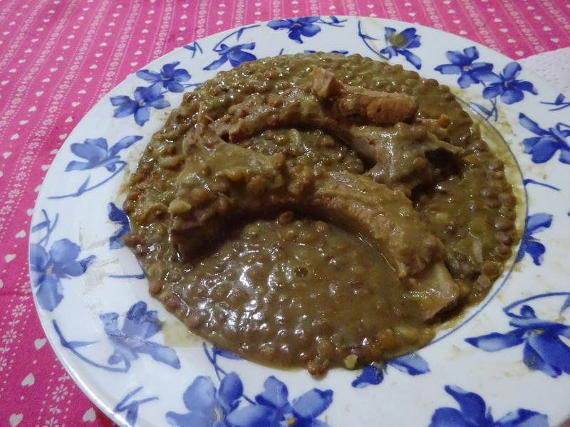 Comida de mañana, lentejas con costillitas de iberico.
