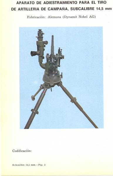 El aparato cuya foto adjunto se empleaba para adiestrar a los alumnos de artillería. Utiliza una munición 14,5x51 DAG. Está fabricado en Alemania. Mi padre (QEPD). Ingeniero de armamento, tenía una agenda de empresa Dynamit Nobel donde especificaba todas sus características técnicas pero al hacer una mudanza la he perdido. Alguien me puede aportar información sobre el mismo.
