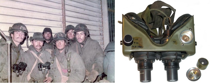 Aparte, durante el conflicto de Malvinas, las tropas argentinas disponían de diversos visores nocturnos: las gafas de visión nocturna AN/PVS 5 (binoculares de segunda generación, con luz IR auxiliar, no acoplables a un arma y con un alcance efectivo de detección de unos 150 m), los AN/ PVS 2 Starlight (visores de primera generación, pasivos y con unos 400-600 m de alcance de detección y, acoplados en un arma, con un alcance de disparo efectivo de 150-200 m) y los N/TVS 4 (visores montados sobre trípode, no he encontrado si de primera o segunda generación, y con un rango de detección efectiva de 800-1200 m).