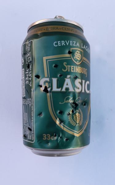 lata de cerveza también a 10 metros, con dos disparos sobre dos hojas y dos latas, los resultados casi