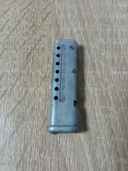El cargador está en buen estado con marcas de uso, funciona perfectamente y es de 8 bolas de capacidad.