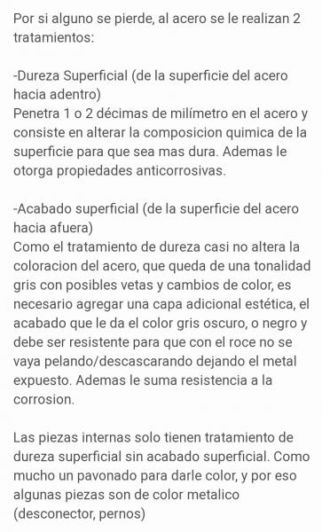 topp escribió:monchi682 escribió:Pues no lo se, si creo que lleva acabado de acero cementado o algo de eso creo que pone, si es eso a lo que te refieres, la verdad de eso no tengo ni idea.
