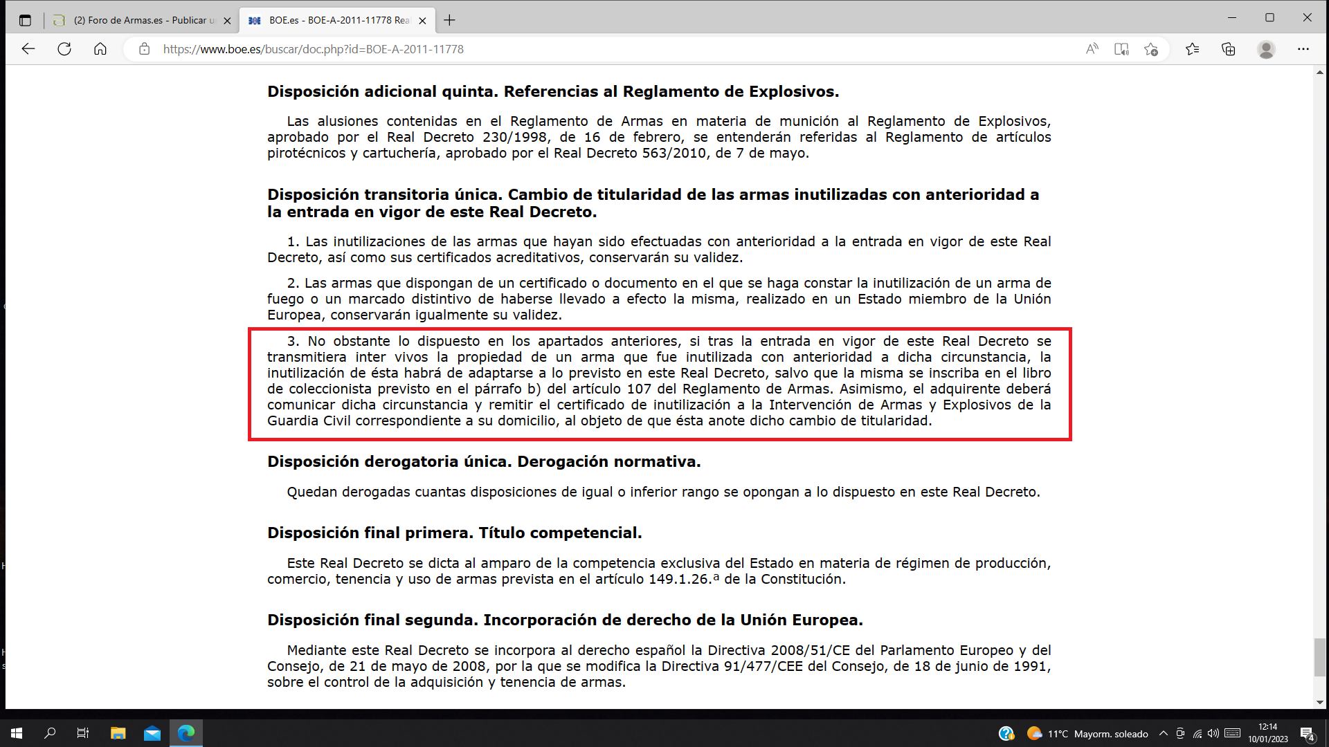 muretti escribió:...yo ya estoy cansado de escuchar que hay que enviar al bope y reunitilizar y eso es incorrecto. Aún nadie ha sido capaz de decirme donde lo pone. Me hacen alusiones al reglamento actual, a las normativas europeas de obligado cumplimiento etc, etc. Sres. alguien se las ha leído? Alguien se ha leido el reglamento? que dicen?, las normativas europeas hacen alusión a la adaptación de las inutilizaciones a la ITC2 para comercialización, trueque, regalo, etc con paises de europa. Para comercio interior, trueque, regalo, etc se regularón con el RD 976/2011 donde todas las posteriores a esta fecha, su inutilización es la marcada en la ITC y que esta en vigor a dia de hoy pero se hace clara alusión a las inutilizadas con anterioridad a esa fecha y mientras se transfieran intervivos (otra cosa es que haya fallecido el titular, donde si se tienen que reinutilizar) se hará de la forma descrita en la Diposición Transitoria unica y este decreto sigue en vigor...