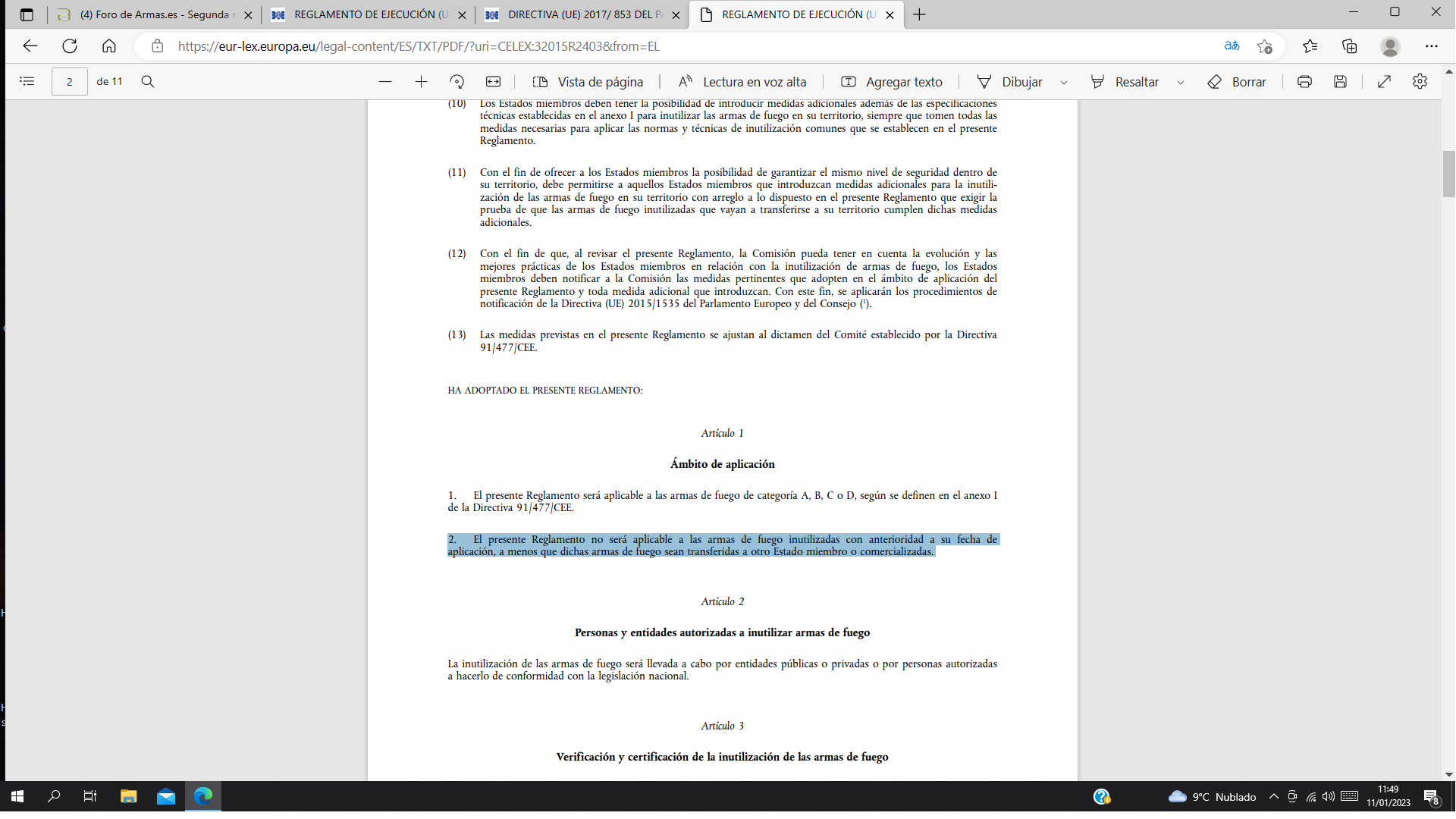 "Las disposiciones establecidas en la ITC 2 de este reglamento no serán aplicables a las armas de fuego inutilizadas con anterioridad a su entrada en vigor, a menos que dichas armas sean transferidas a otro Estado miembro o comercializadas, incluida la transferencia gratuita, el intercambio o el trueque".