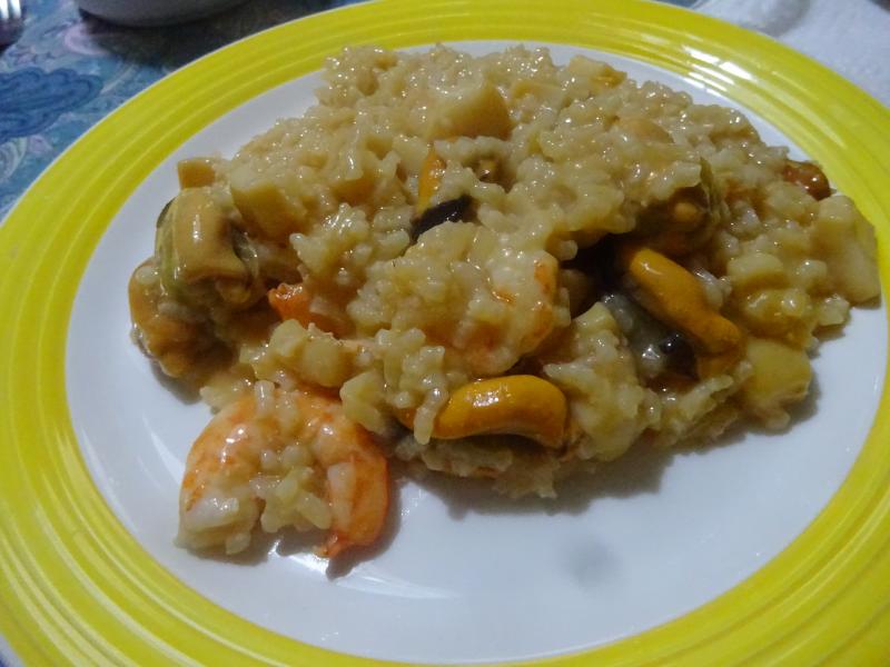 Arroz de Calasparra caldoso, con bichos marinos (pescada, mejillones, pota y gambas de Huelva), con fumé de caparazones de las gambas. Rico, rico.
