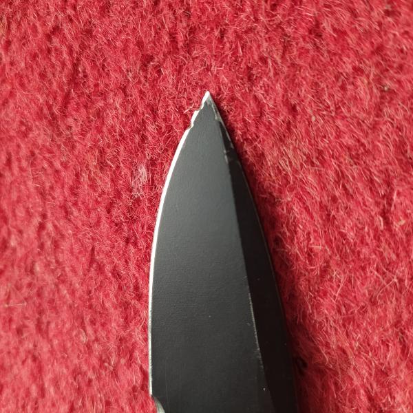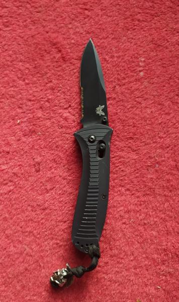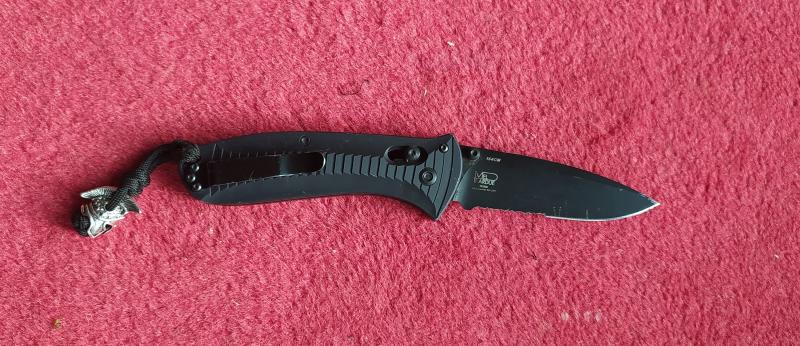 Navaja Benchmade Presidio 5000 SBK, acero 154 CM, 58-61 HRC, hoja de 87 mm, largo total (abierta) 209 mm, peso 157 gramos, hoja drop-point parcialmente serrada, bloqueo AXIS LOCK (posiblemente uno de los mejores del mundo). Marcas normales de un uso ligero, salvo dos "picotazos" cerca de la punta (si eres mañoso lo puedes corregir, y sino un buen afilador te lo soluciona). Ya descatalogada, su precio rondaba los 240 euros/dólares.